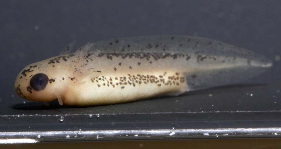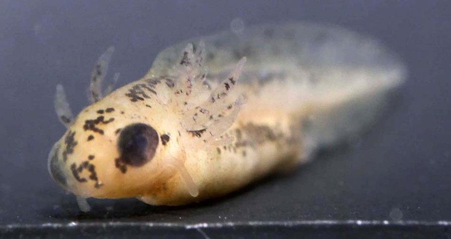 孵化直後の幼生は全長が1センチほどで、カエルのオタマジャクシの頭を小さくしたような感じです。手足は発達しておらず、頭の後ろにフサフサとした外鰓(えら)が目立ちます。