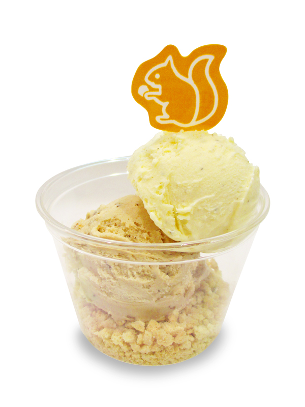 リスは漢字で「栗鼠」と書くことにちなんで、栗とバニラのアイスを組み合わせました。アイスの下にはザクザクとした食感のビスケットがしかれていて、味のアクセントにもなっています。
