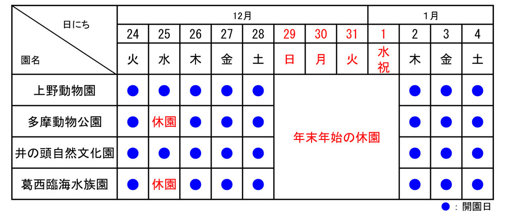都立動物園・水族園は年明け2025年1月2日(木)9時30分から開園します。年末年始の開園日は以下のとおりです(