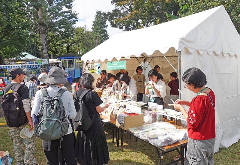 メイン会場では、例年ヤマネコの生息地である対馬や西表島で活動する保全団体がブース出展し、活動紹介や物販をおこなっていました。今年は加えて小笠原諸島、奄美大島で活動する団体が出展したため、島の生きものについて幅広く学べる内容になりました。
