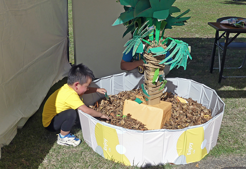 また各団体も出展内容をくふうしていました。たとえば、自然環境研究センター(小笠原諸島ブース)では、カタツムリ探しゲームをおこなっていました。小笠原諸島では、落ち葉の下や、木の上など、生息環境に合わせ独自の進化をとげたカタツムリが100種類以上生息しています。それを模して、落葉や木の皮の間などに隠されたカタツムリシールを探すゲームがおこなわれました。小さな子どもから大人まで、楽しくカタツムリを探しながら「小笠原諸島にはたくさんの種類のカタツムリがいる!しかも、それぞれすんでいる場所が違う!」とうれしそうに話していました。