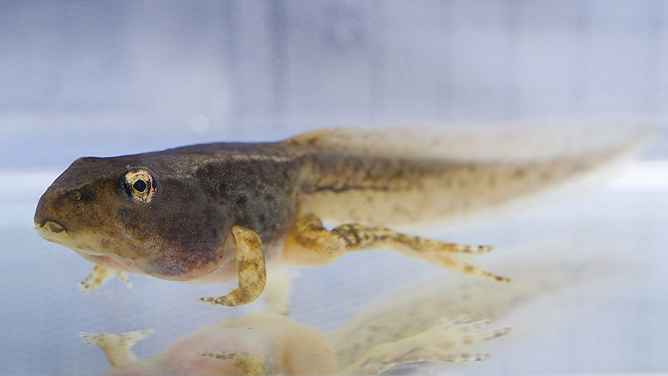 手足の生えたニホンアカガエルのオタマジャクシ。この後上陸し、尾も吸収されてなくなっていく
