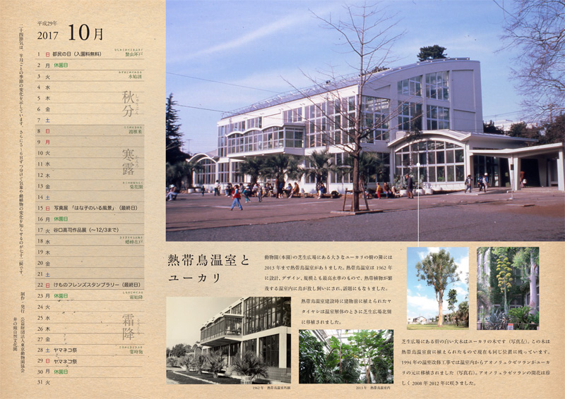 その花ごよみの番外編としてカレンダーを毎月発行しています。二十四節気と七十二候や、井の頭自然文化園の動植物、イベント情報を掲載したカレンダーです。最新版は2017年10月。ダウンロードはこちらから