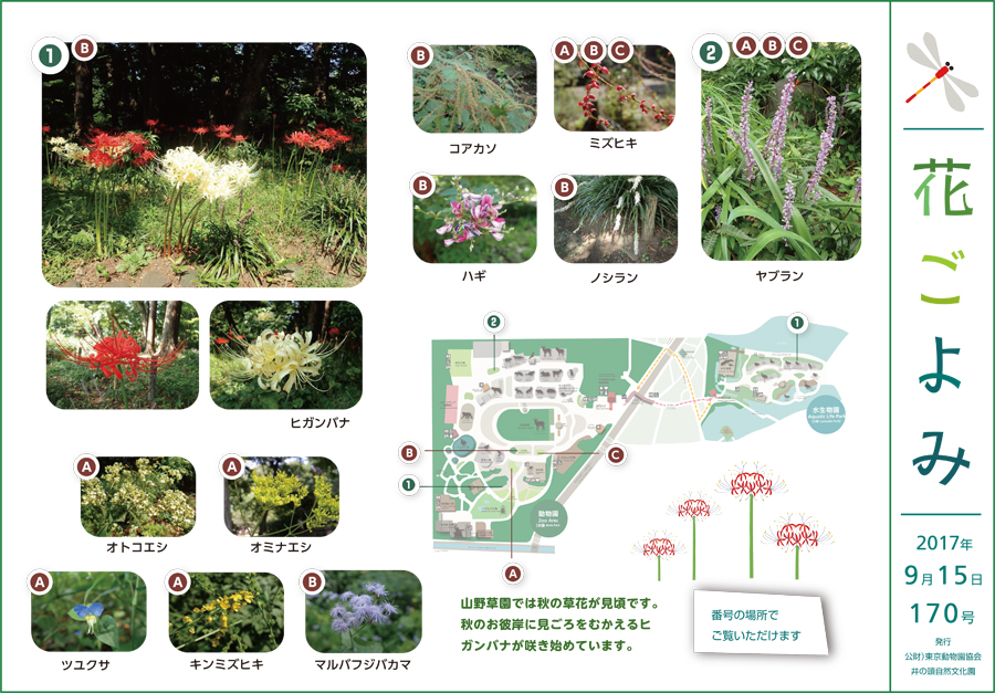 井の頭自然文化園の山野草園では秋の草花の季節を迎えました。秋のお彼岸に見ごろをむかえるヒガンバナも咲き始めています。