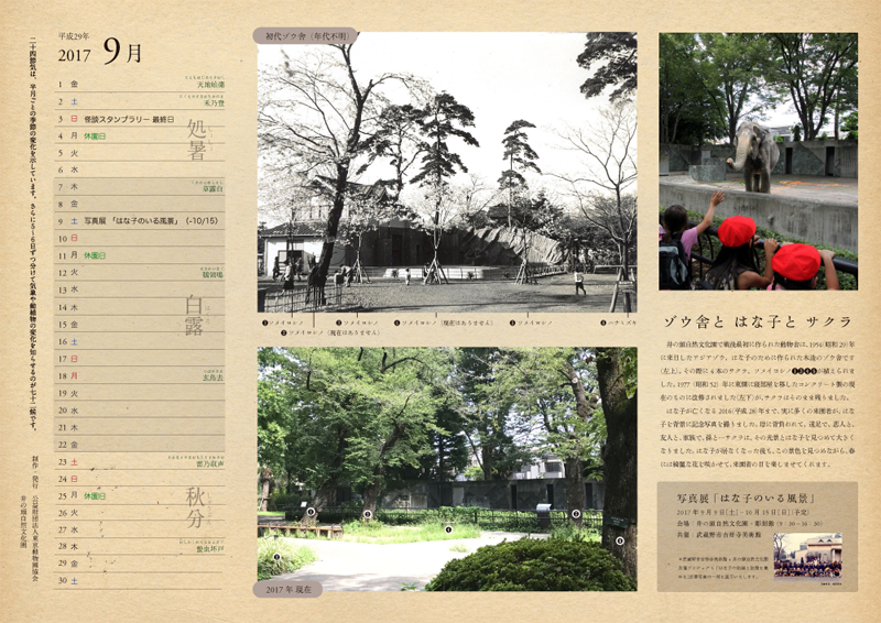 その花ごよみの番外編としてカレンダーを毎月発行しています。二十四節気と七十二候や、井の頭自然文化園の動植物、イベント情報を掲載したカレンダーです。最新版は2017年9月。