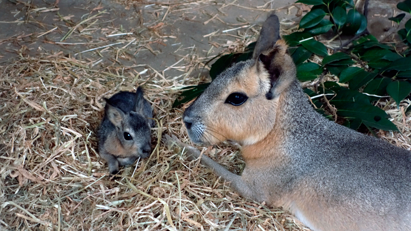 マーラは、テンジクネズミ科に分類される齧歯類です。一見、ネズミのなかまにはとても思えない姿をしていますが、しかしさすが齧歯類。日々の成長はいちじるしく、あっという間に大きくなります。ぜひ、今しか見られないマーラの子の愛らしい姿を見に来てください。