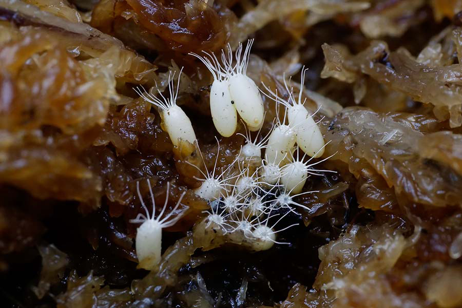 タイコウチの卵の上部には呼吸のための糸状突起がついている。本体部分の長さは4ミリほど