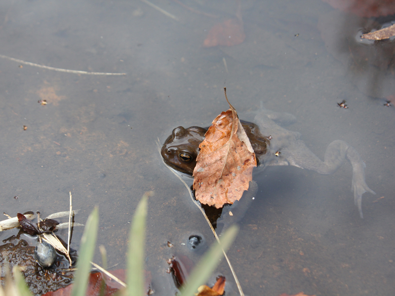 3月24日に見かけたアズマヒキガエル。落ち葉に隠れている?