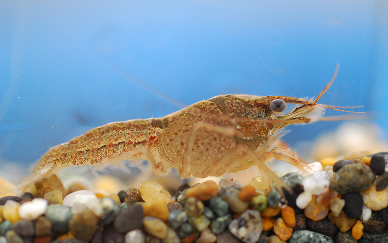 アメリカザリガニの子ども。小さいときは体の色はうす茶色でハサミも小さい