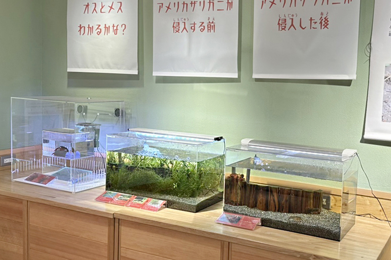 | 特設展示場のようす | アメリカザリガニが侵入する前と後の池のようすを イメージした水槽 |