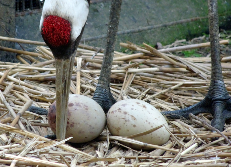 ペア形成した2014年は繁殖にはいたりませんでしたが、2年目の2015年には5月24日と27日に初めて産卵しました。タンチョウは通常1〜2個を産卵し、約1か月かけてオスとメスが交代で抱卵します。ツル舎ののペアも抱卵をしっかり交代でおこない、仲むつまじい姿を見せていました。