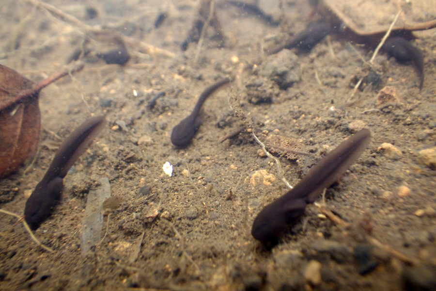 池ではアズマヒキガエルが卵塊を産み、少しずつ孵化したオタマジャクシが泳ぐようすが見られるようになりました。
