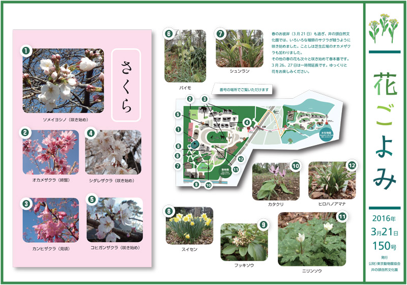 その他の春の花も次々と咲き始めて春本番です。3月26日、27日は1時間延長です。ゆっくりと花をお楽しみください。(花ごよみ150号を記念して、井の頭自然文化園でご覧いただける植物を紹介したリーフレットを作成中です。ご期待ください!)