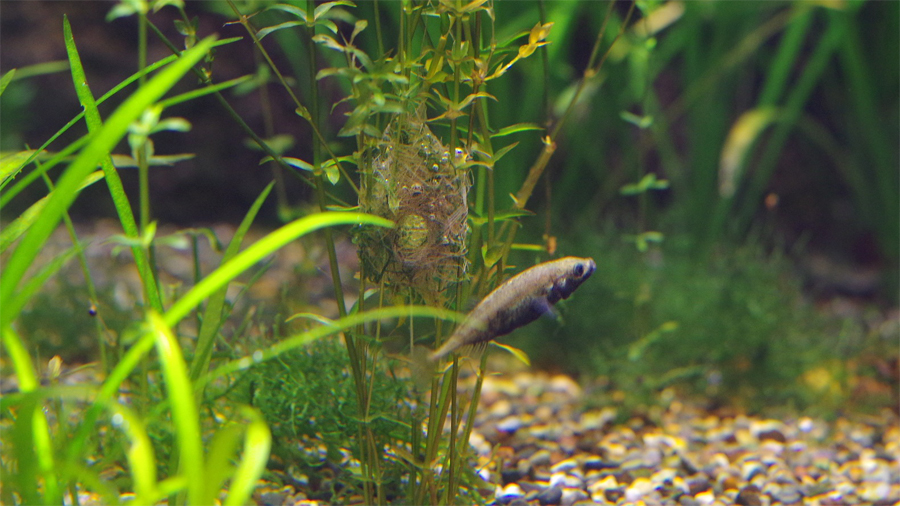 オスは巣のまわりをなわばりとし、成熟したメスを見つけると巣に産卵してもらおうと誘いに向かいます。水槽には卵でお腹がふくらんだメスが何尾もいて、オスがメスたちを誘っているのが何度も観察されました。