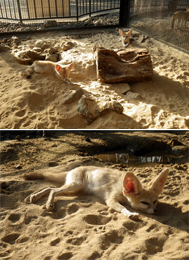 ほとんど寝て過ごす日中も、全身を伸ばして砂にひたって(?)いたり、顔を砂にうずめていたり、実に気持ちよさそうな寝姿を見せています。夏休みも残りわずか。あたらしい放飼場のフェネックたちにぜひ会いにきてください。
