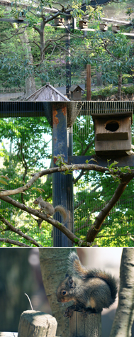 野生では高い木の上に巣をつくる動物なので、「リスの小径」ではケージの一番高いところに計30個の巣箱を並べて設置しています。