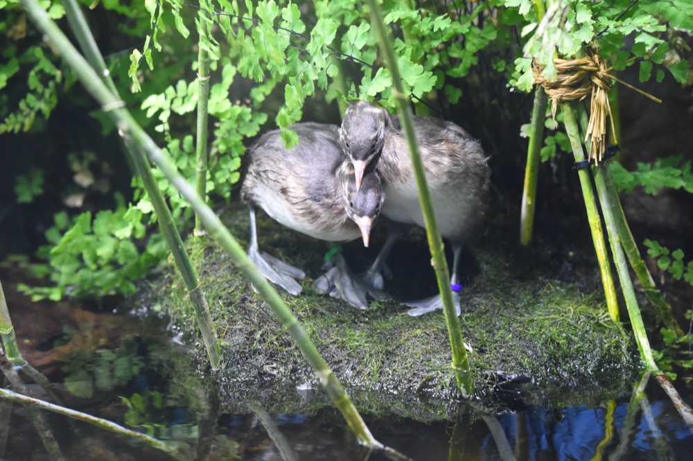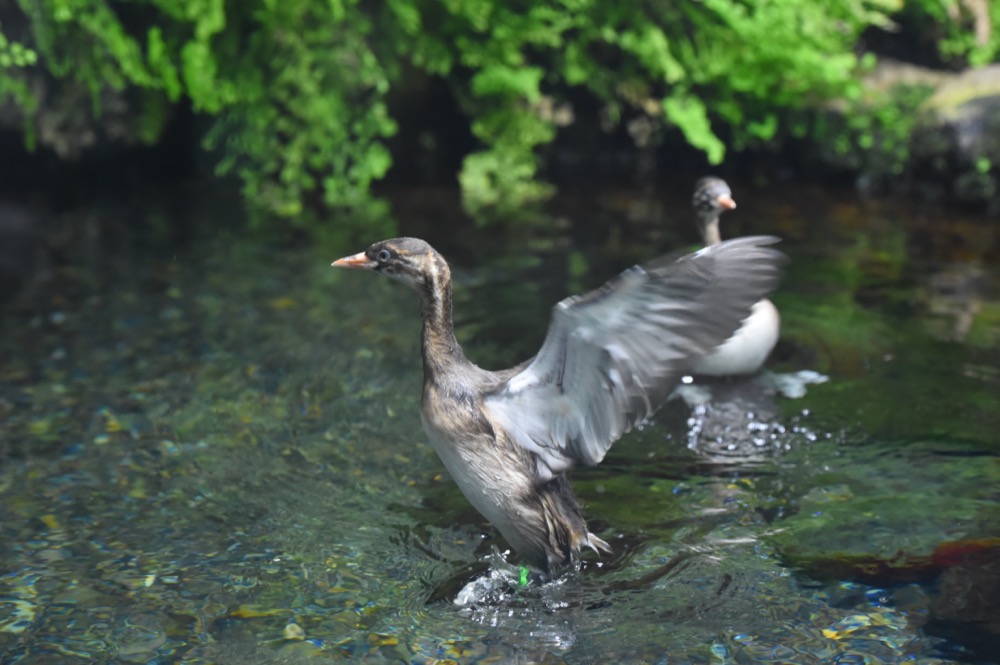 今年の2月に生まれた幼鳥です。3月におこなった性別検査により2羽ともオスとわかりました。順調に成長し4月現在、親鳥と同じくらいの体重になりました。カイツブリは巣立ちまで1か月から2か月といわれており、この2羽もすでに巣立ちの時期を迎え、時には母鳥から追い出されるような行動がみられることもありました。
