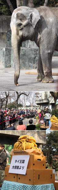 また大使館からはタイ直輸入のタイ産バナナをなんと120キログラムもいただきました。私たちがスーパーで買うのはフィリピン産やエクアドル産が多く、タイのバナナはほとんど見ることがありません。とても香りがよく、はな子も故郷のバナナを美味しそうに食べていました。この120キログラムものバナナは、はな子1頭で食べるには何日分にもなります。バナナが傷んで無駄になってはもったいないので、ほかの動物たちもごちそうになりました。ほかにもお手紙や、イラスト、お花や果物などもたくさんいただきました。本当にありがとうございます。