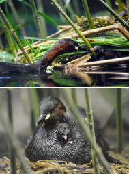 親鳥はさらに本物の卵を3つ、擬卵を2つあたためています。順調にいけば、全部で5羽のひなが見られるはずです。ひなの成長はとてもはやく、孵化後2週間ぐらいで、親の背中には入りきらないほど大きくなり、ほとんど水面で過ごすようになります。興味深い行動が見られるのはほんのわずかな間ですので、お早めにどうぞ。