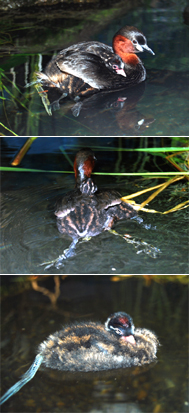 ひなは潜水のしかたが徐々にうまくなってきました。水中をよく見ていて、弱った小魚(モツゴ)を潜って捕まえることもあります。孵化してからまだ12~17日しか経っていませんが(2009年7月2日現在)、いろいろなしぐさがおとなっぽくなってきました。鳥の成長はものすごく早いものだと感心する毎日です。背中から顔を出すひなが見られるのは、もうあとわずかな期間だと思います。