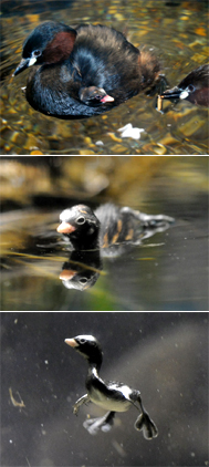 親鳥はひなを背中の羽の下に入れたまま、しばしば水中に潜ってしまいます。ふだんと変わらない、すばやい動きで泳いでしまうのにはびっくりです。潜水中、こらえきれずにひなが背中から落ちてしまうこともあります。でも大丈夫。ひなは孵化直後から泳ぐことができますし(写真中)、なんと孵化したその日に短い距離を潜水することさえできるのでした(写真下)。