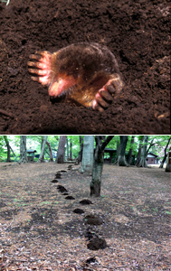 モグラは土の中でくらし、地中を移動しながら採食します。おもにミミズや昆虫の幼虫を食べますが、冬眠中のカエルやカタツムリなども食べます。大きな前足をシャベルのように使ってトンネルを堀り、そのとき地上に運び上げた土がモグラ塚となるのです。