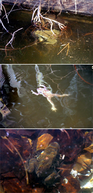その後の探索により、熱帯鳥温室の前に作られた池の周囲に、10匹ほどのアズマヒキガエルを見つけました。どのカエルも近づいても逃げず、そっとつついててみても。かなりにぶい反応でした。