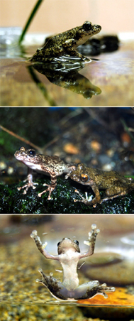 カジカガエルの手足の指には吸盤があり、ふだん、水槽の中では葉っぱやガラスに張りついてじっとしています。しかし、捕まえようとすると、動きはとても素早く、狭い隙間に潜り込んで隠れてしまうこともあります。「捕まえたっ!」と思っても、指の隙間からするっと逃げられてしまうこともたびたびで、水槽の中でも捕まえるのがとても大変なカエルです。