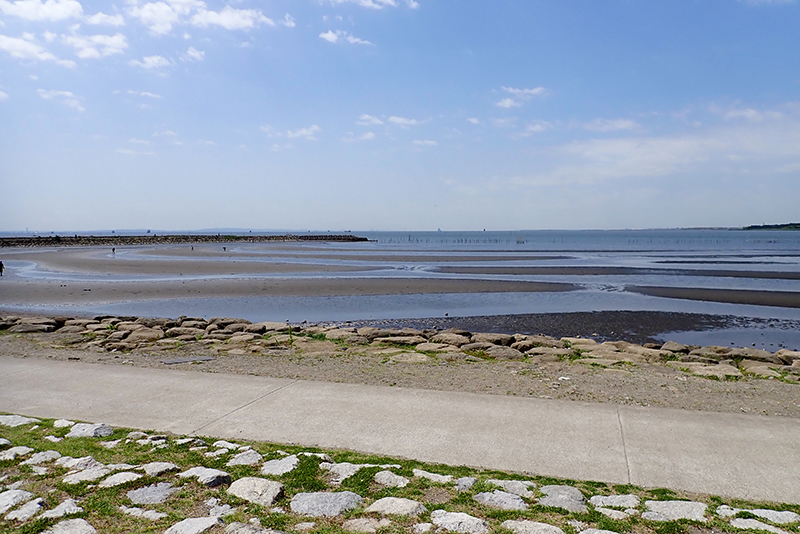 葛西臨海水族園のすぐ近く、葛西海浜公園の人工干潟「西なぎさ」ではたくさんの生きものを見つけることができます。潮が引くと西なぎさは遠くまで陸地が広がります。