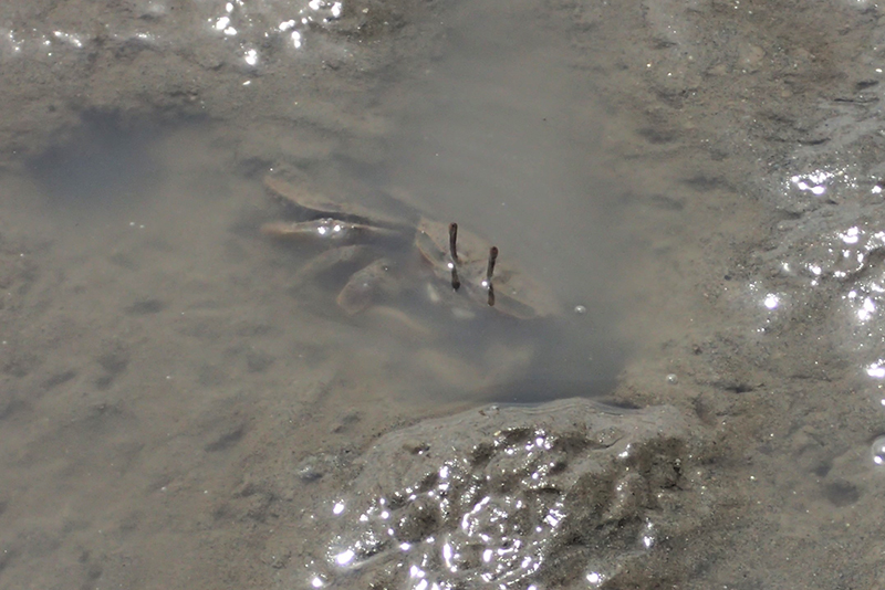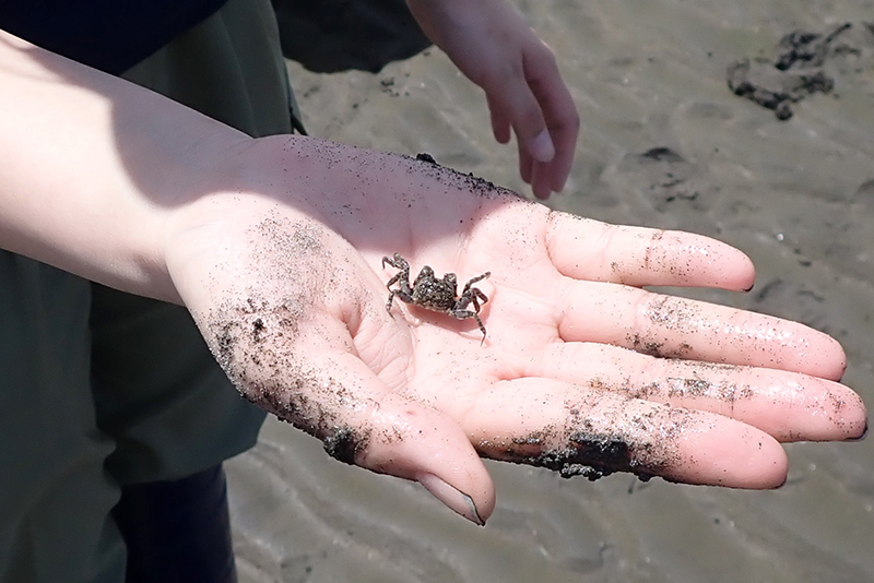 さらに沖の方へ進んでいくと今度はところどころに泥地が広がります。ドロドロした地面に深く足を取られるとなかなか抜けません。日常ではあまり体験しない感覚にきっとハラハラドキドキするはずです。そんな泥地にもたくさんの生きものがくらしています。