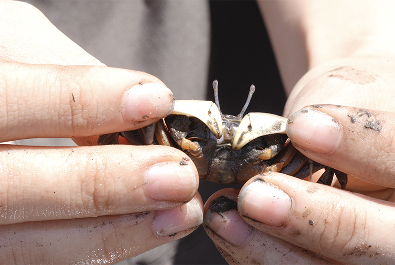 ためしに穴に指を入れてみると、まっすぐ下に伸びていることがわかります。穴を崩さないように慎重に、慎重に、深く掘り進めていくとコメツキガニという小さなカニが見つかります。