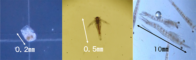 シオミズツボワムシ(左)、ブラインシュリンプ(アルテミア)の幼生(中央)、イサザアミのなかま(右)