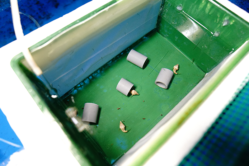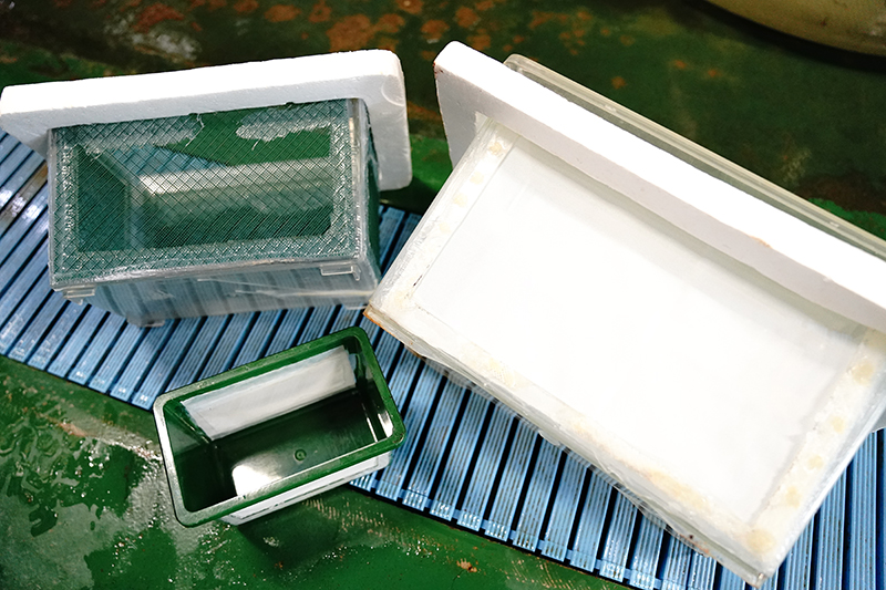 この飼育容器は市販のプラスチックケースを加工して、側面に布やネットを張りつけています。これを水槽に浮かべ、水槽の水をエアリフトで送ったり、エアレーションをおこなったりすることで水槽内と同じ水温や水質を保ち育成できます。さらにえさが抜けない目合いのネットを使用することで常にえさがある状態をつくり、稚魚たちがいつでもえさを食べることもできます。しかし、食べかすやフンが溜まり、汚れやすく、病気が発生しやすいため、毎日の掃除は欠かせません。ちなみにこの飼育容器を作成するのもスタッフの仕事です。そして大きく成長したら展示水槽へデビューしています。