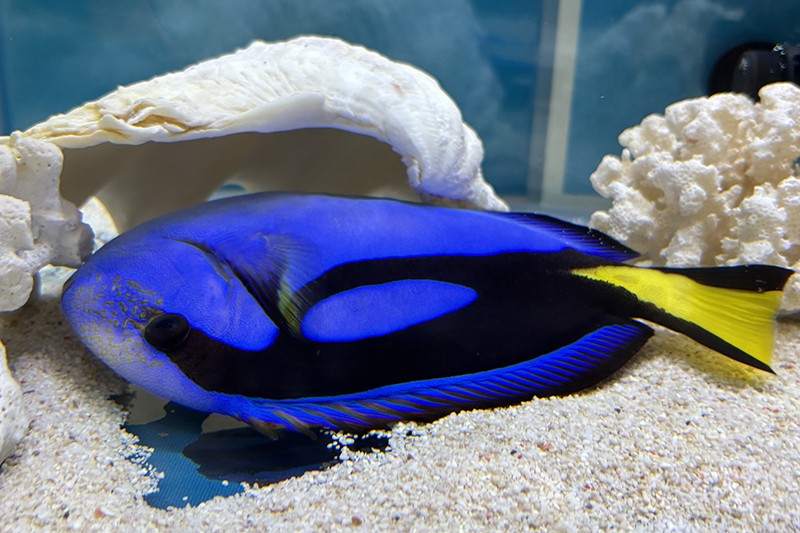 ナンヨウハギは、おもに熱帯に分布するニザダイ科の魚のなかまで、日本では高知県以南に生息しています。黄色い尾びれや濃い青色の体色が特徴的な魚です。アニメ映画にも登場しており、種名を知らなくてもその姿をご存じの方も多いかもしれません。