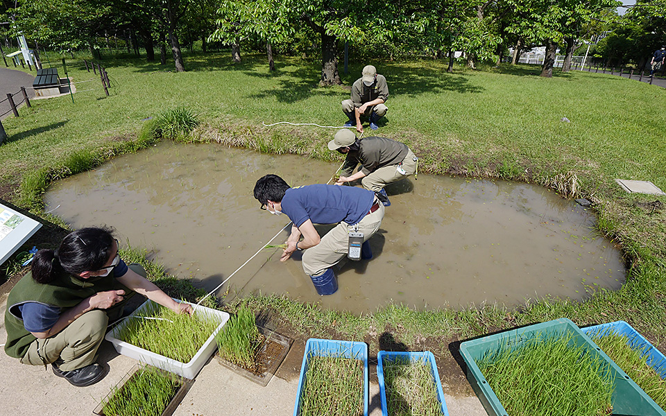 今回お伝えするのは、水族園の屋外展示「水辺の自然」エリアにある、小さな「田んぼ」での米づくりのようすです。