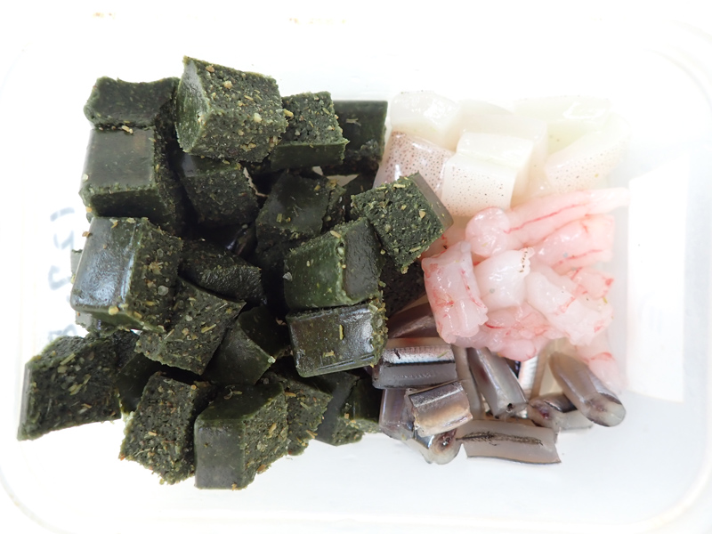 アオウミガメのえさ:植物性人工えさ、イカ、アマエビ、キビナゴ