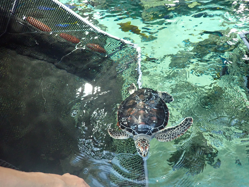 また、水槽内の魚たちに取られないよう、準備したえさをすべて食べさせるためにカゴに入れて与えています。はじめのうちはウミガメたちを捕まえてカゴに入れていましたが、だんだんとカゴに入ったらえさがもらえることを覚え、今では自らカゴに入るようになりました。