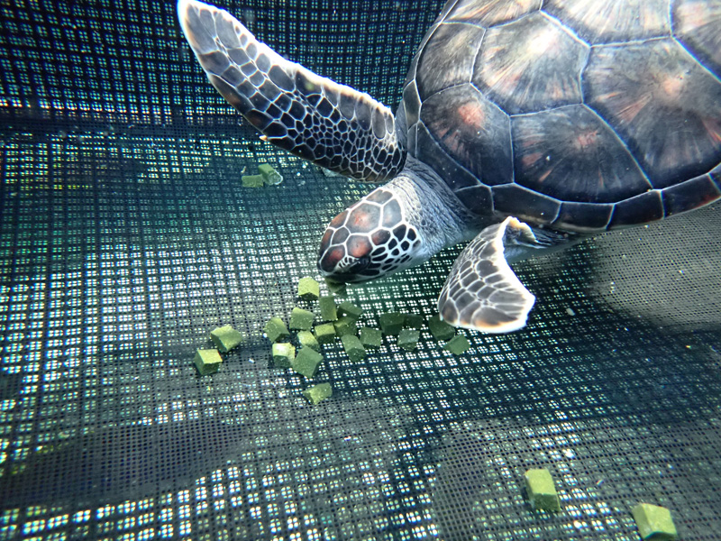アオウミガメは、孵化後1年ほどは主にクラゲやカニなどを食べる雑食性です。体重が4.5kgを超えたあたりから、徐々に海藻や海草、藻などを主に食べる草食性になります。水族園に来たばかりのときには動物性のえさを体重の10%分を与えていましたが、昨年の12月から植物性人工えさを与えるようにし、成長速度が速すぎないように与えるえさの分量を徐々に減らしました。そして、今年の7月からは、植物性人工えさの割合を体重の2%分まで増やし、新たに小松菜を与え始め、えさの量は体重の3%分を与えています。