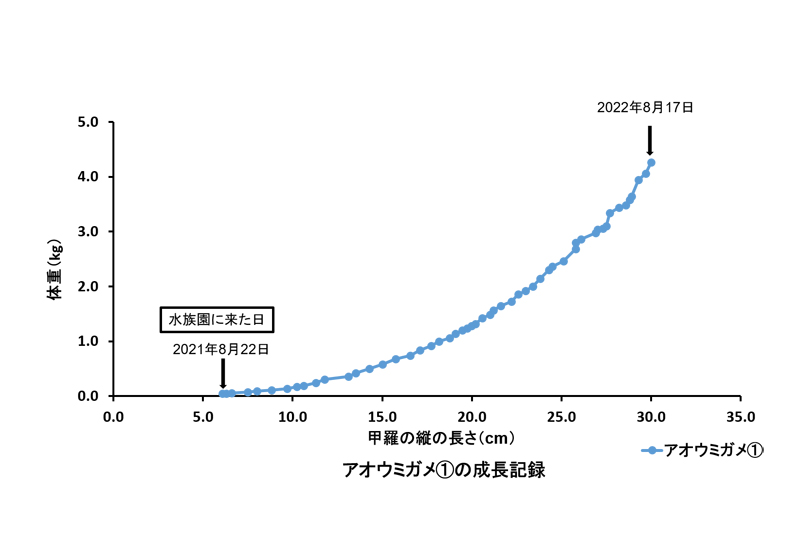 アオウミガメは、1週間に1回、甲羅の縦の長さと体重を計測しています。水族園で以前飼育していたアオウミガメの成長速度を調べてみると、他園館の個体よりも速いことがわかりました。それを参考に、より適切な速度で成長させるため、与えるえさの量や種類、割合を見直すことにしました。