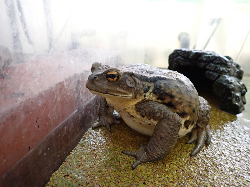 以前は身近な生き物だったカエルのなかま(両生類)も、東京都内ではくらせる環境が減ってしまい、見られる場所は限られてきました。葛西臨海水族園の「水辺の自然」エリアでは、都内に生息する両生類の展示を通して、こうした現状を伝えています。また、裏側では9種の両生類を多数飼育しており、飼育下繁殖にも取り組んでいます。そのうちの一種がアズマヒキガエルです。
