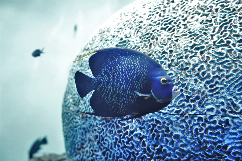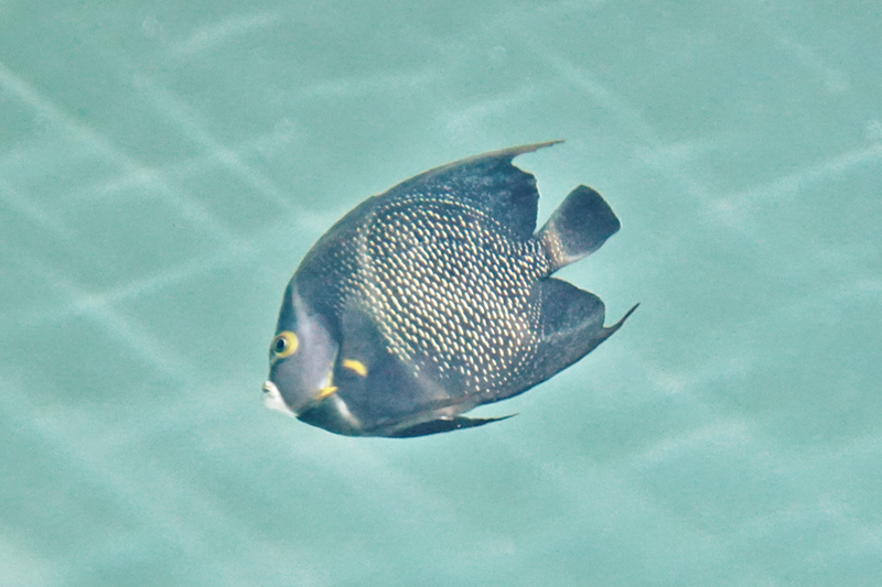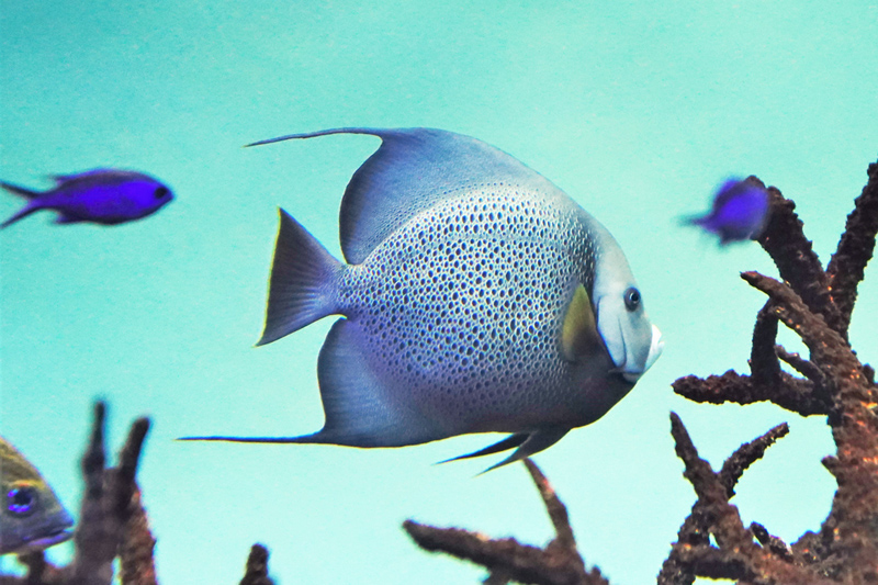 フレンチエンゼルフィッシュとグレイエンゼルフィッシュは、おもにフロリダ半島からブラジル沿岸の西大西洋のサンゴ礁域に生息するキンチャクダイのなかまです。2種はよく似ていますが、フレンチエンゼルフィッシュは黒い体色に黄色に縁どられた鱗をもつこと、グレイエンゼルフィッシュはその名のとおり灰色の体色をしていることが特徴です。