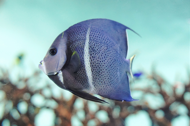 今回は、帯模様があるフレンチエンゼルフィッシュとグレイエンゼルフィッシュをそれぞれ2尾ずつ展示しました。大きさは成魚に比べて半分ほどで、この帯模様は幼魚期の名残りとなります。幼魚の時期は、どちらも成魚とは異なり黒い体色に4本の黄色の帯模様が頭から尾にかけて入っているのが特徴です。これは、幼魚が成魚のなわばり内に入ってしまっても同種と認識されず、攻撃されないためだと考えられています。
