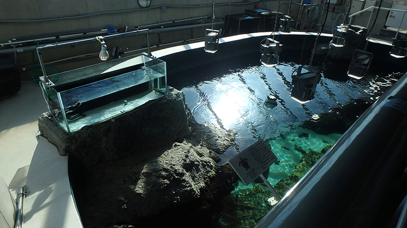 2021年10月から「東京の海」エリア、「小笠原の海4」水槽の2階、キャットウォークから見える小水槽でアオウミガメの子どもを2頭展示しています。今回はこの子ガメへのえさやりの工夫についてご紹介します。