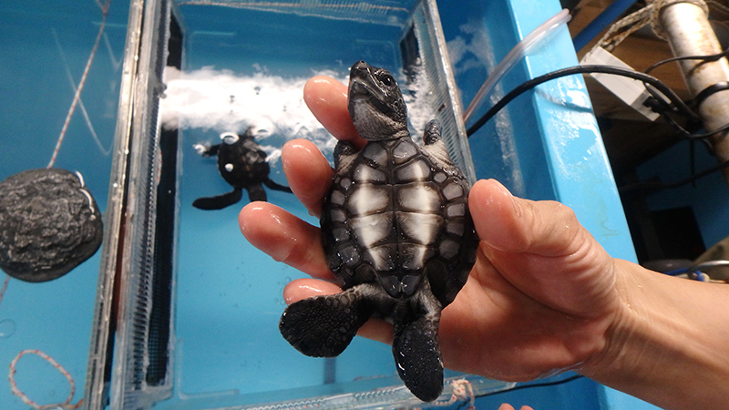 このアオウミガメは2021年7月に小笠原諸島母島で孵化し、1ヵ月ほど現地で飼育されたのち、水族園にやってきました。当時の子ガメはまだ小さく、甲羅の縦の長さが約6㎝、体重40gと手のひらに乗るほどでした。