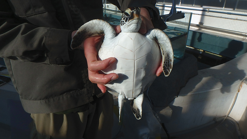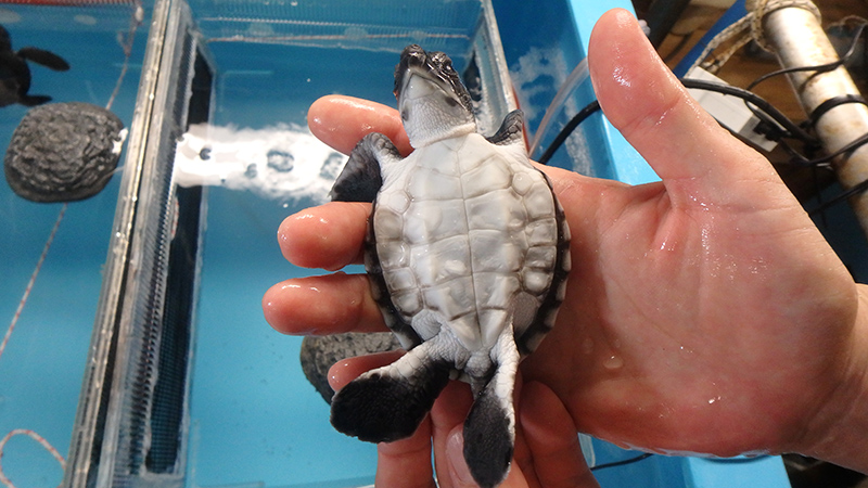 現在(孵化後約5ヵ月)は甲羅の縦の長さが約18.5cm、体重約1kgまでぐんぐん成長し、このまま順調に成長すれば、来春にはほかの魚が泳ぐ大きな水槽で展示することができそうです。今後の成長にご期待ください。