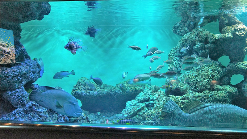 葛西臨海水族園の世界の海エリア「南シナ海」水槽では、タマカイやドクウツボなどの大型魚から、アカマツカサやトガリエビスなどの中型魚まで、さまざまな魚を展示しています。