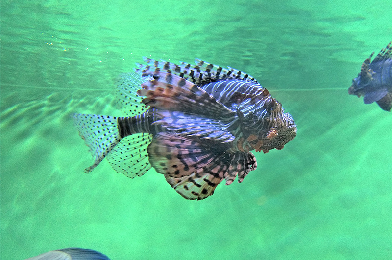 ハナミノカサゴは大きなひれと縞模様が特徴的で、水槽内でも目立つ体をしています。大きなひれを広げてこの目立つ体をアピールしながら水槽内を泳いでいますが、何をアピールしていると思いますか?