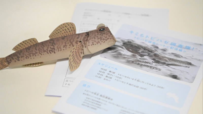 まず、資料を事前に郵送しました。資料の中身は、トビハゼの体のつくりをいろいろな角度から観察できるペーパークラフトや、参加者自身がプログラムの内容を書き込めるようになっているオリジナルの「トビハゼ調査シート」です。