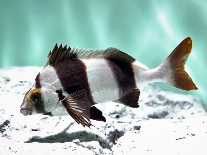 葛西臨海水族園「世界の海」エリアの「オーストラリア南部」の水槽にはマグパイパーチを展示しています。スズキ目タカノハダイ科のこの魚は、オーストラリア南部やニュージーランド周辺に生息し、幼魚の時期は浅い岩礁域に小さな群れをつくり、成長するとともに水深60mまで生息範囲を広げます。