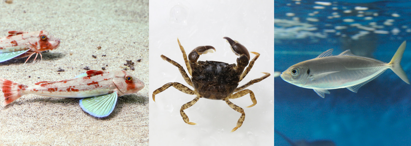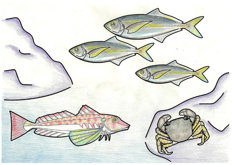 ホウボウ、タカノケフサイソガニ、マアジ